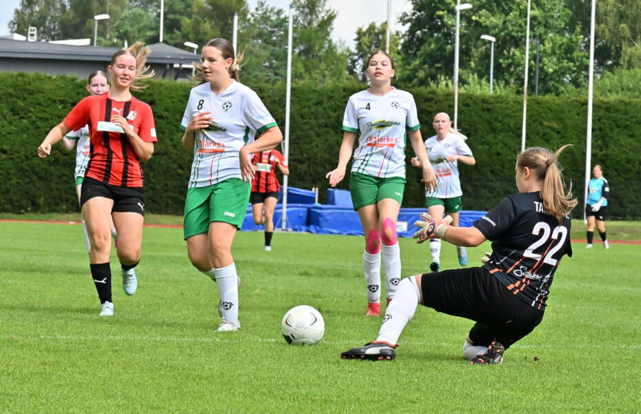 Iida Taimela (22) piti hyvillä torjunnoillaan SoVon tyttöjoukkueen pitkään mukana pelissä Liedon Palloa vastaan. Kuvassa SoVon pelaajista myös Emmy Lundberg (8) ja Minea Ahonen (4).