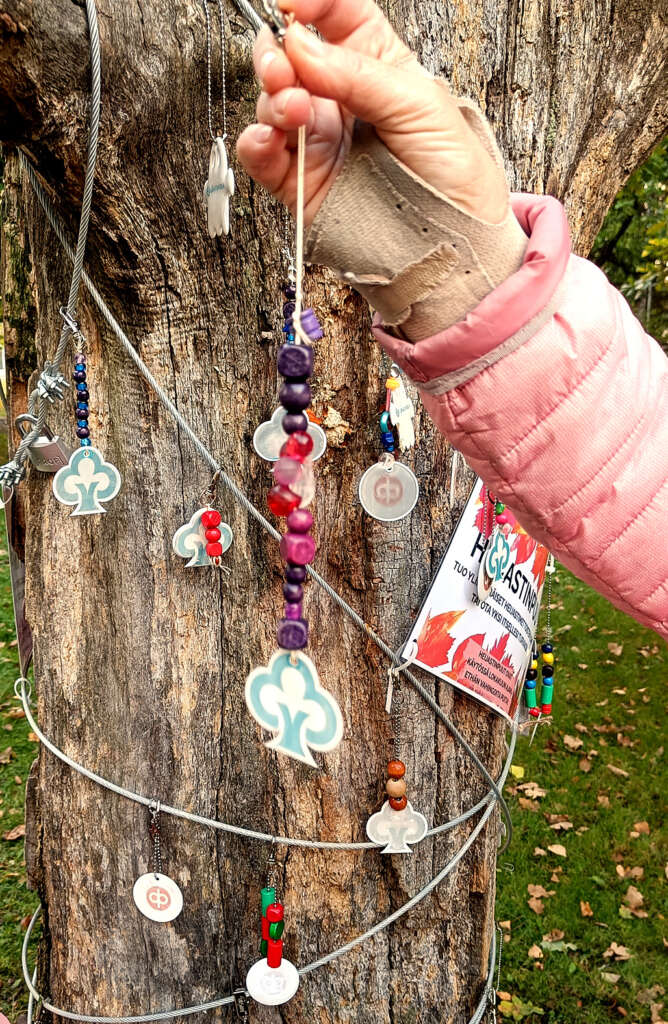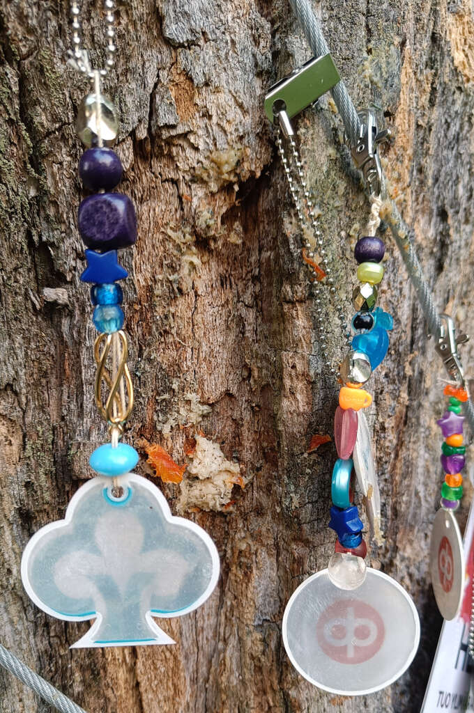 Kiiruun puiston heijastinpuut ovat puhjenneet kukkaan. Yltä löytyy heijastimia helmillä, esimerkiksi koristelluilla naruilla ja hauskoilla kuvilla.