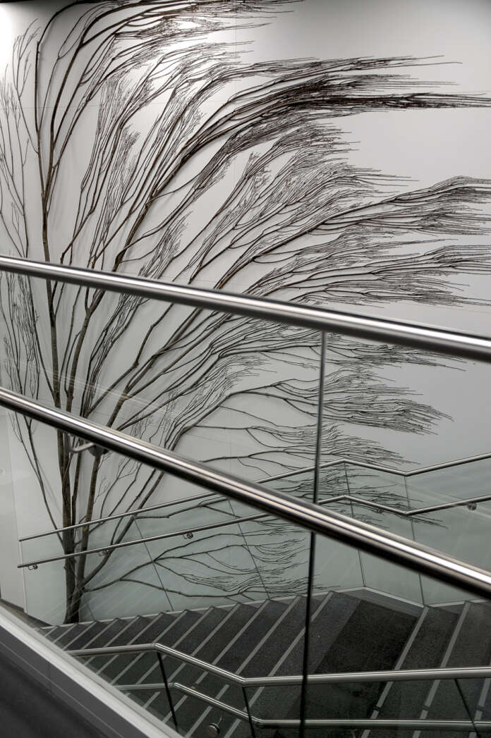 Antti Laitisen teos Kiiruun koulukeskuksen aulan portaikossa johdattaa opiskelijat Someron lukion tiloihin talon yläkertaan.